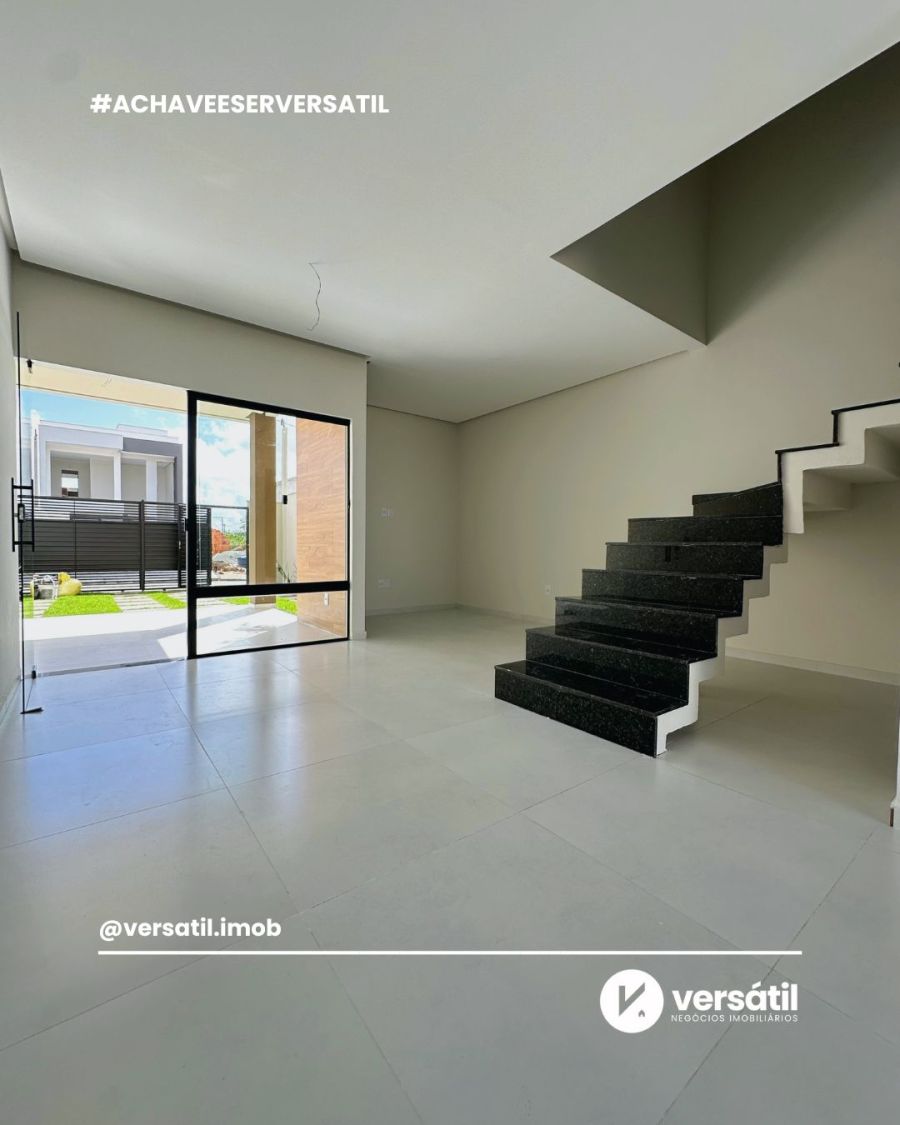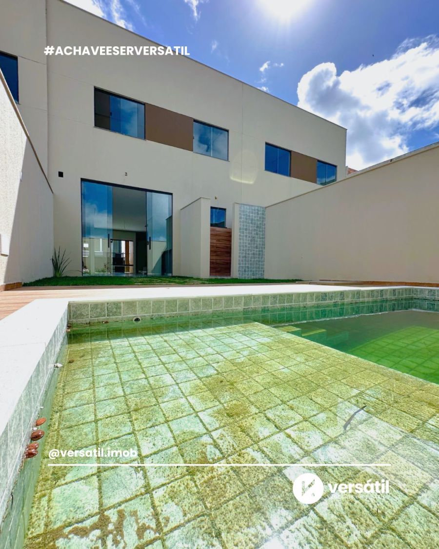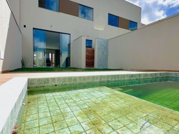 Sala de estar/jantar e espaço para sala de TV, escada de acesso ao pavimento superior, lavabo, cozinha integrada com espaço gourmet, área de serviço, chuveirão e piscina.